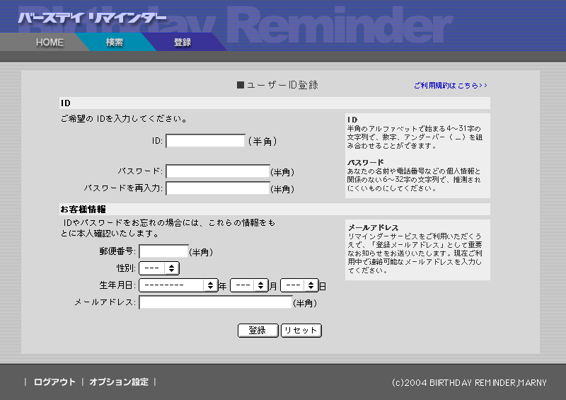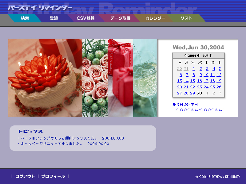 【SITE イメージ】 ビジネスとパーソナルと2タイプそれぞれ提案します。 1・使いやすさ(ユーザビリィティ) + 親しみやすさ(フレンドリー) 2・機能的でビジネスライクなデザイン。 【KEYWORDS】 誕生日・数字・生まれる・生命・祝い・ケーキ・ロウソク スケジュール・暦・十二支・誕生石・誕生花・宇宙 バイオリズム・占い・カード・プレゼント・笑顔・喜び 【HOME PAGE デザイン案】 ・第1フェーズ(今回) 現状の機能+携帯対応でデザイン変更 ・第2フェーズ 機能を充実/よりマーケティング重視に ユーザーがインターフェースを選択できる