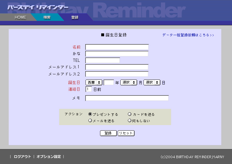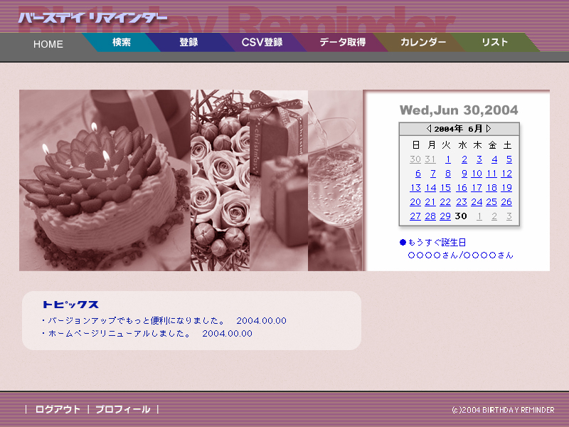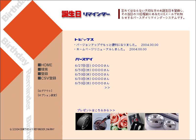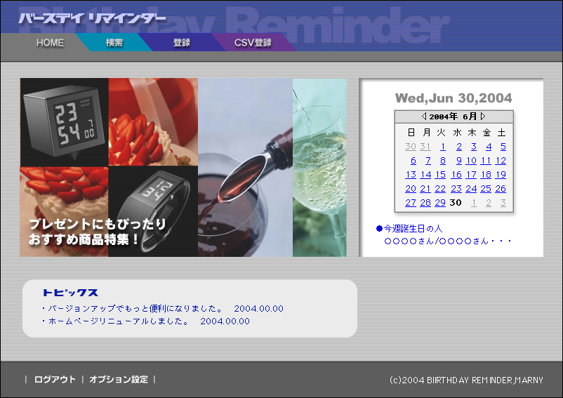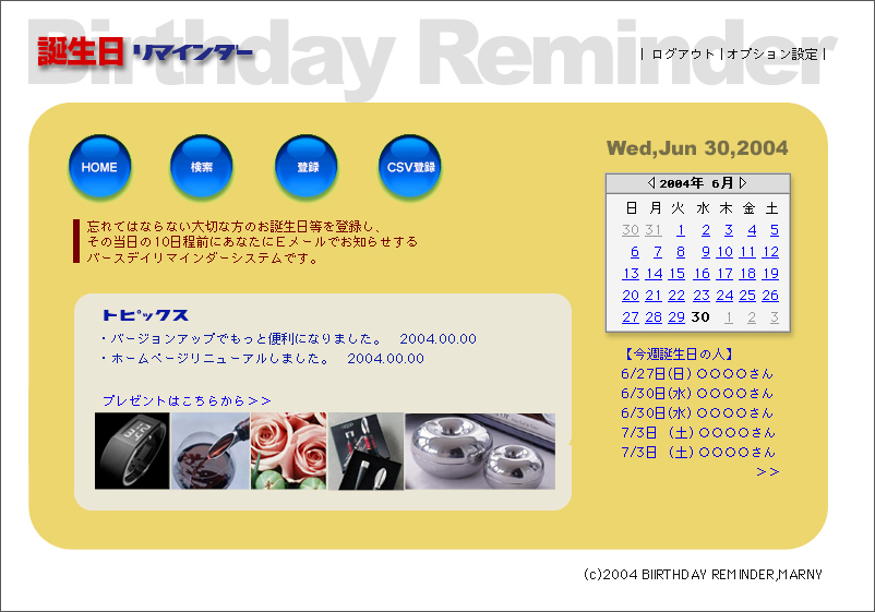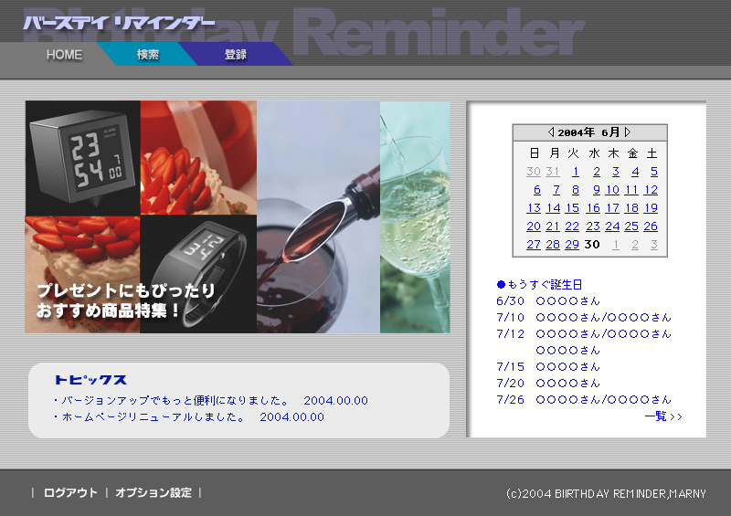 使いやすさ(ユーザビリィティ) + 親しみやすさ(フレンドリー) ・誕生日リマインダー以外の機能はメニューから外す ・外した機能は[オプション設定]もしくは[個人設定]にいれる ・レイアウトC案ベースで再度デザイン展開しました。(G/H案はかなりレイアウト変わってしまいました。)